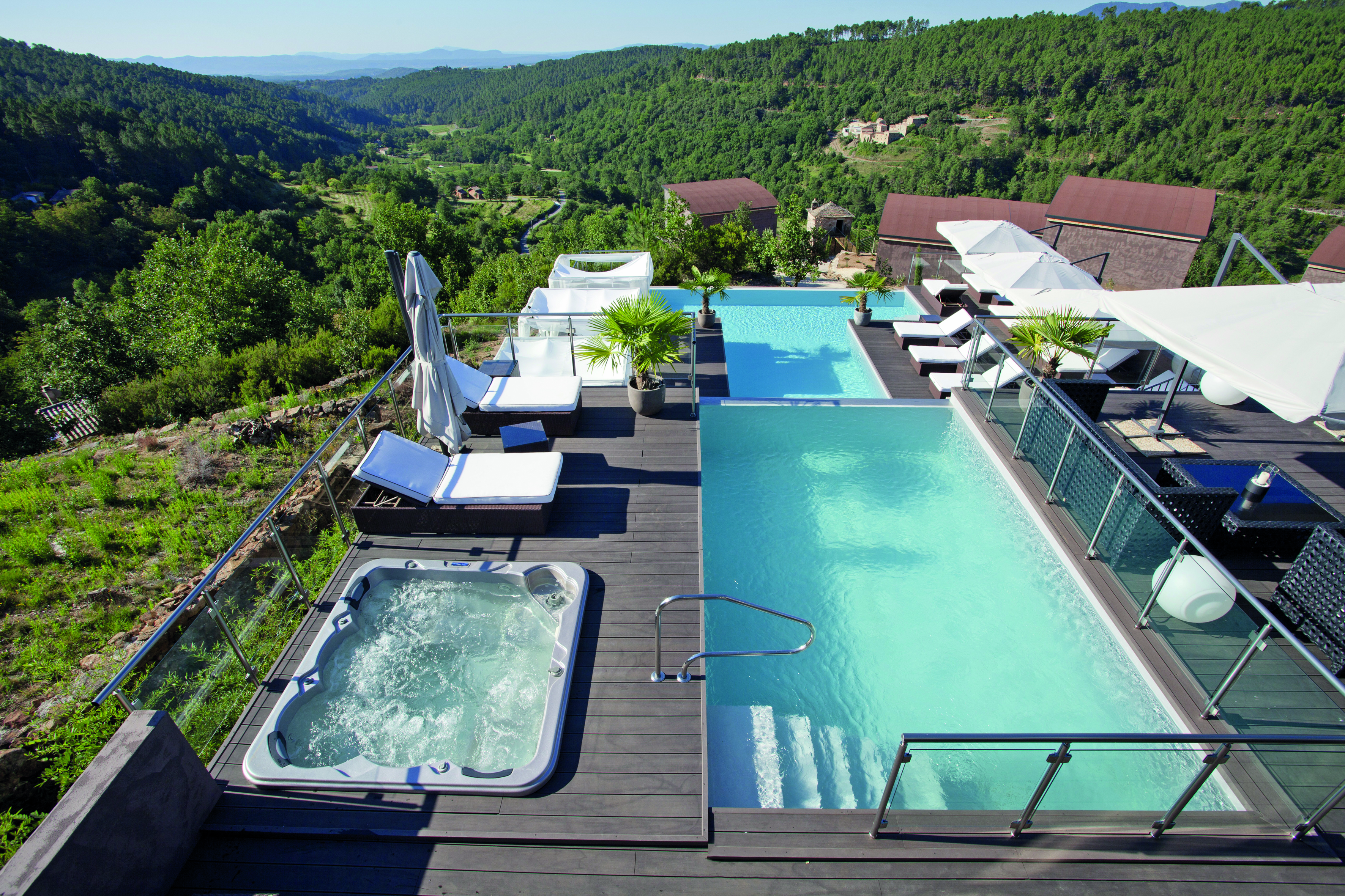 Situé dans le sud de l’Ardèche, l’hôtel-spa Domaine de Chalvêches a ouvert ses portes en avril 2014. Cet établissement de luxe propose une dizaine de lodges répartie sur 12 000 m2 au milieu d’une végétation méditerranéenne. Au cœur de l’établissement se tiennent un restaurant panoramique, le Carré Rouve, ainsi que 2 piscines à débordement d’une superficie totale de 94 m2. Les piscines ont été réalisées par Ardèche Service Piscine, concessionnaire Carré Bleu aux Vans (07). L’entreprise est dirigée par 2 associés, Guillaume Berne et Frédéric Place, et réalise 20 à 25 piscines familiales maçonnées chaque année, principalement dans un rayon de 30 km autour des Vans. Ardèche Service Piscine réalise aussi chaque année au moins une piscine de collectivité.