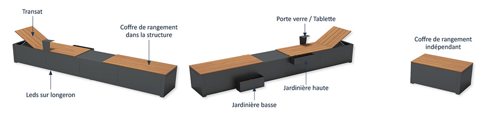 Le BANC Dsign est adaptable dans toutes les configurations de bassin et pour tous les usages. Plusieurs combinaisons sont possibles selon l’espace disponible et les envies du client grâce à ses éléments interchangeables et évolutifs : transats, jardinières, coffre de rangement ou autres accessoires.