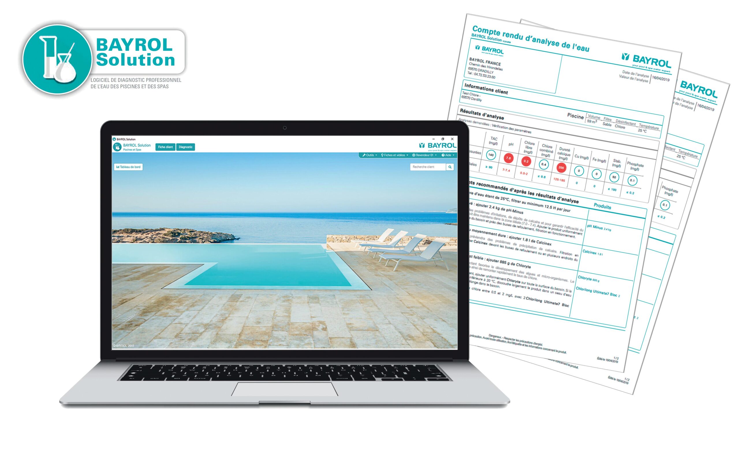 À partir des mesures renseignées, le logiciel génère un rapport complet d’analyse de l’eau, indiquant les étapes de traitement à effectuer, les produits Bayrol préconisés et les différents dosages. Ce document peut être imprimé ou enregistré en PDF pour être envoyé par e-mail, ou être archivé dans l’historique des analyses de l’utilisateur, dont l’espace est protégé par un mot de passe.