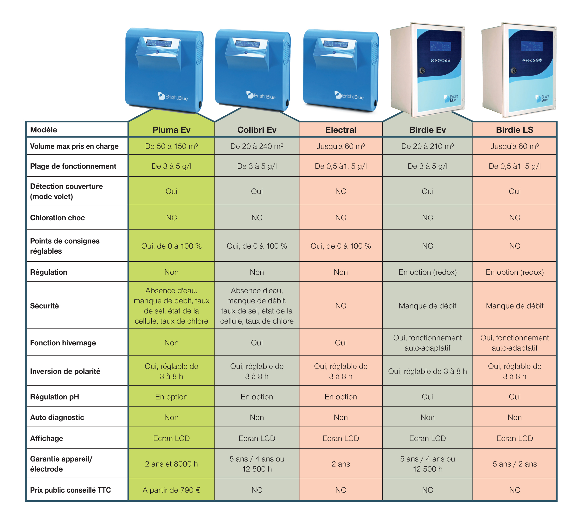 Les électrolyseurs BrightBlue se distinguent par leurs cellules monopolaires et leurs boîtiers compacts réalisés en polycarbonate très résistant. À noter également le dispositif de variation de l’alimentation qui permet de réduire la chaleur en fonctionnement.