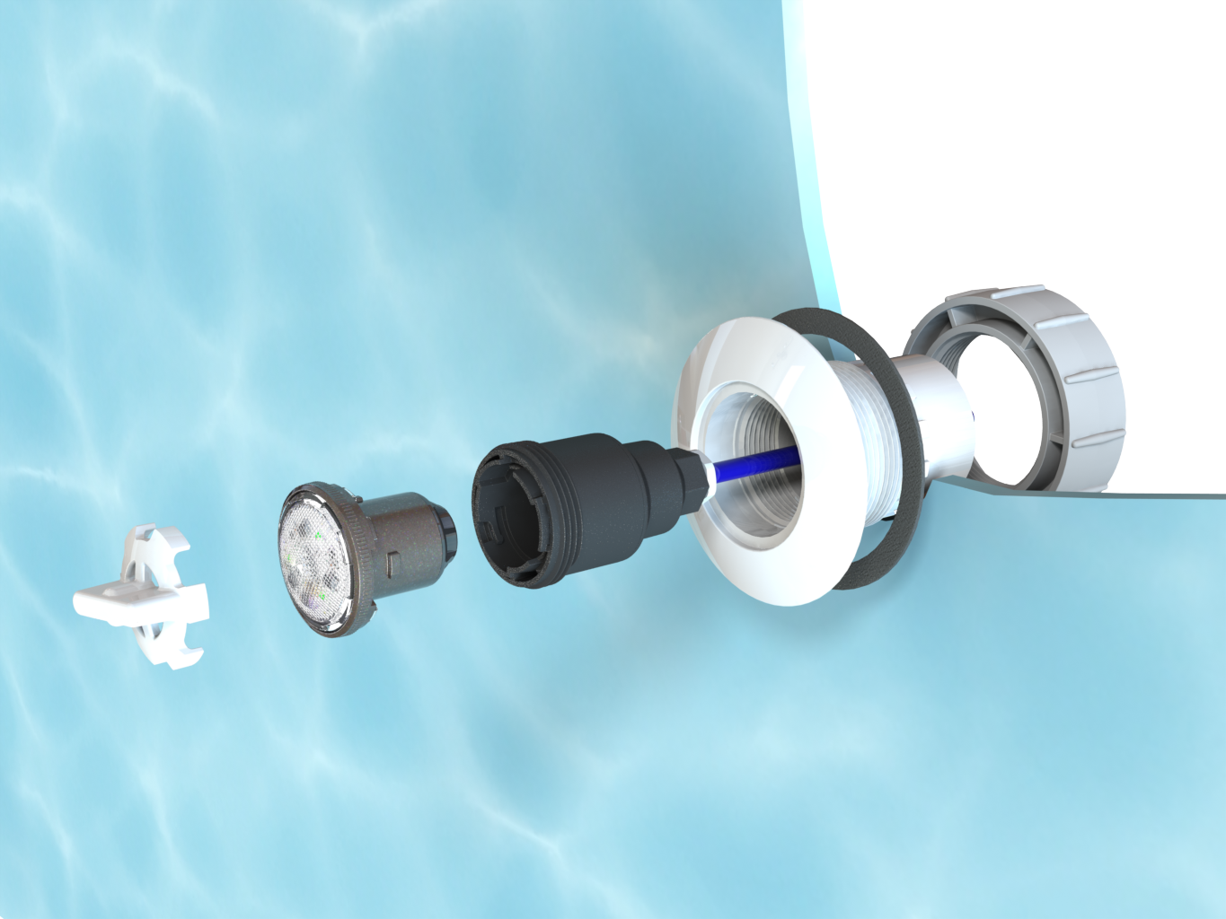 Compatible avec tous les types de bassin, le Micro Plug-in-Pool de CCEI se compose d’une embase, alimentée en 12V AC se vissant dans un refoulement 1.5’’ (vérifier références compatibles) pour une intégration dans la paroi. Cette embase est un support destiné à recevoir une ampoule sans fil. Une fois installée, celle-ci s’allume dès que l’embase est alimentée. Ces projecteurs LED sont monochromes avec des couleurs différenciées (blanc froid, cyan, bleu profond, etc.) et projettent une puissance lumineuse maximale de 100 %.
