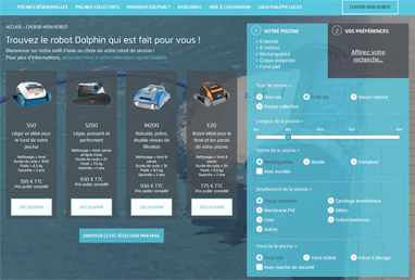 De gauche à droite : Vidéo de démonstration d’un robot Maytronics, vidéo de démonstration d’une piscine connectée Hayward, configurateur de pompe à chaleur SCP