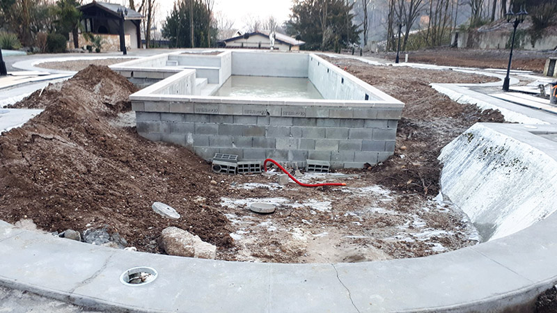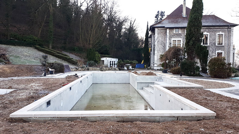 « Lorsque les clients ont acheté cette propriété pour la rénover, ils voulaient intégrer une piscine au cœur de l’ancienne. Nous avons entamé le chantier à l’automne 2018 et l’avons terminé au printemps 2019. Nous avons réalisé un bassin de 20 mètres par 5 mètres et d’une profondeur de 1,35 mètre. Pour cela, nous avons coulé une dalle béton à l’intérieur du bassin, puis nous avons édifié le mur. Le chantier était très facile d’accès. Conformément au souhait des clients, nous avons construit une structure en couloir de nage. Cette forme était la plus adaptée étant donné la configuration de l’ancien bassin. En effet, nous avons été obligés de construire le couloir de nage au pied des pentes de l’ancien bassin. Leur inclinaison de 45° a conditionné considérablement la largeur du nouveau bassin. Nous avons aussi décidé de laisser la grosse margelle en béton de la précédente structure.
