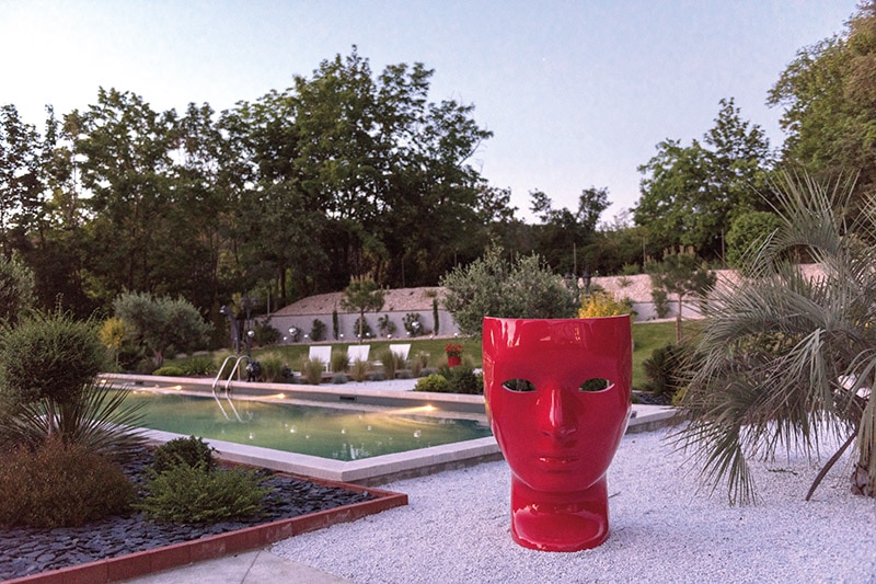 « Avec ce très grand jardin, l’idée était d’avoir des lieux où l’on se sente tout seul, tranquille, en paix, dans une maison loin de la ville et des zones urbanisées. Nous avions une vision claire de ce que nous voulions en termes d’abords. J’ai demandé à Serge Renard de nous faire juste une structure. En effet, passionnés par le jardin, nous tenions à planter nous-mêmes les 450 végétaux (oliviers, lauriers, cyprès, palmiers, etc.) présents autour de l’espace piscine. Nous avons semé la pelouse pendant le confinement », souligne Philippe Dieterich.