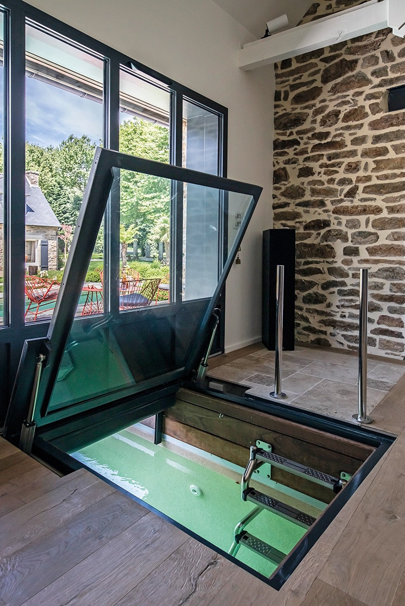 “Une des contraintes techniques du projet a résidé dans la mise au point de la trappe électrique, souhaitée par le client, permettant d’accéder au couloir d’eau. Cette trappe est équipée de 2 moteurs basse tension et de 2 vérins. Elle est constituée d’un panneau de verre vraiment épais qui la rend très lourde. Le client avait une idée très précise de ce qu’il souhaitait et a beaucoup participé à son élaboration. La trappe devait s’ouvrir grâce à une clé pour une manipulation sans efforts. Nous n’avons ni fourni, ni posé la trappe, nous nous sommes chargés de la caler. Son installation a nécessité l’intervention d’un électricien. La descente dans le couloir de nage se fait par une échelle sur mesure à la demande du client. Il voulait une échelle composée de marches décalées les unes par rapport aux autres.”