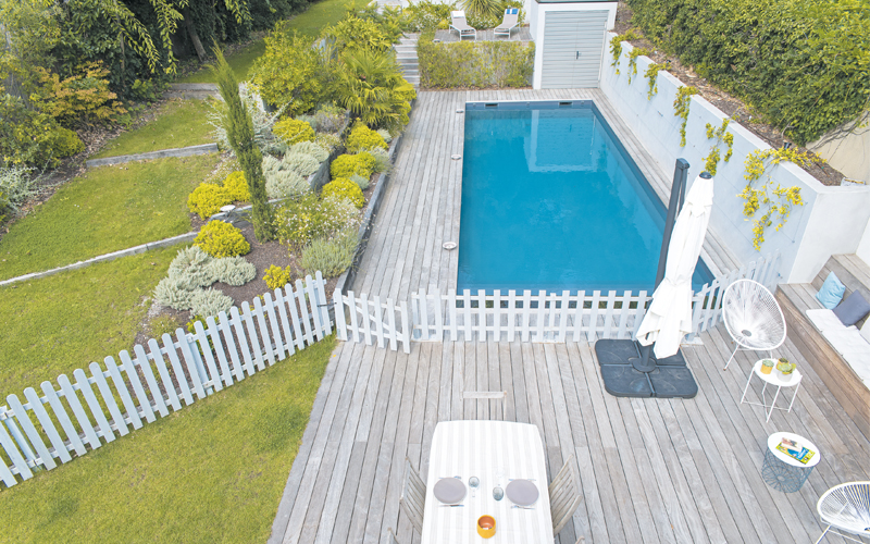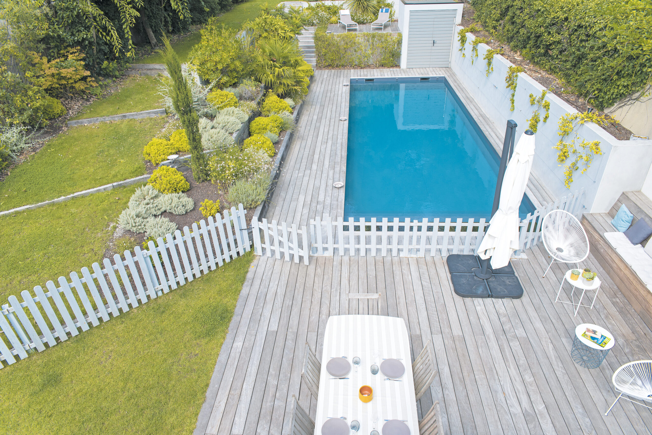 En raison du relief et de la proximité de la partie paysagée, la gestion des eaux de pluie a constitué l’une des autres problématiques du projet. La solution : les terrasses périphériques en ipé. « Elles sont posées sur des lambourdes qui sont elles-mêmes posées sur des plots de béton. Toutes les terrasses récupèrent l’eau qui passe entre les lames et s’infiltre dans les terres. Il n’y a pas de dalle béton sous les terrasses. Pour l’évacuation des lavages des filtres, nous nous sommes raccordés au réseau public d’eaux usées », détaille Stanislas Tymowski.