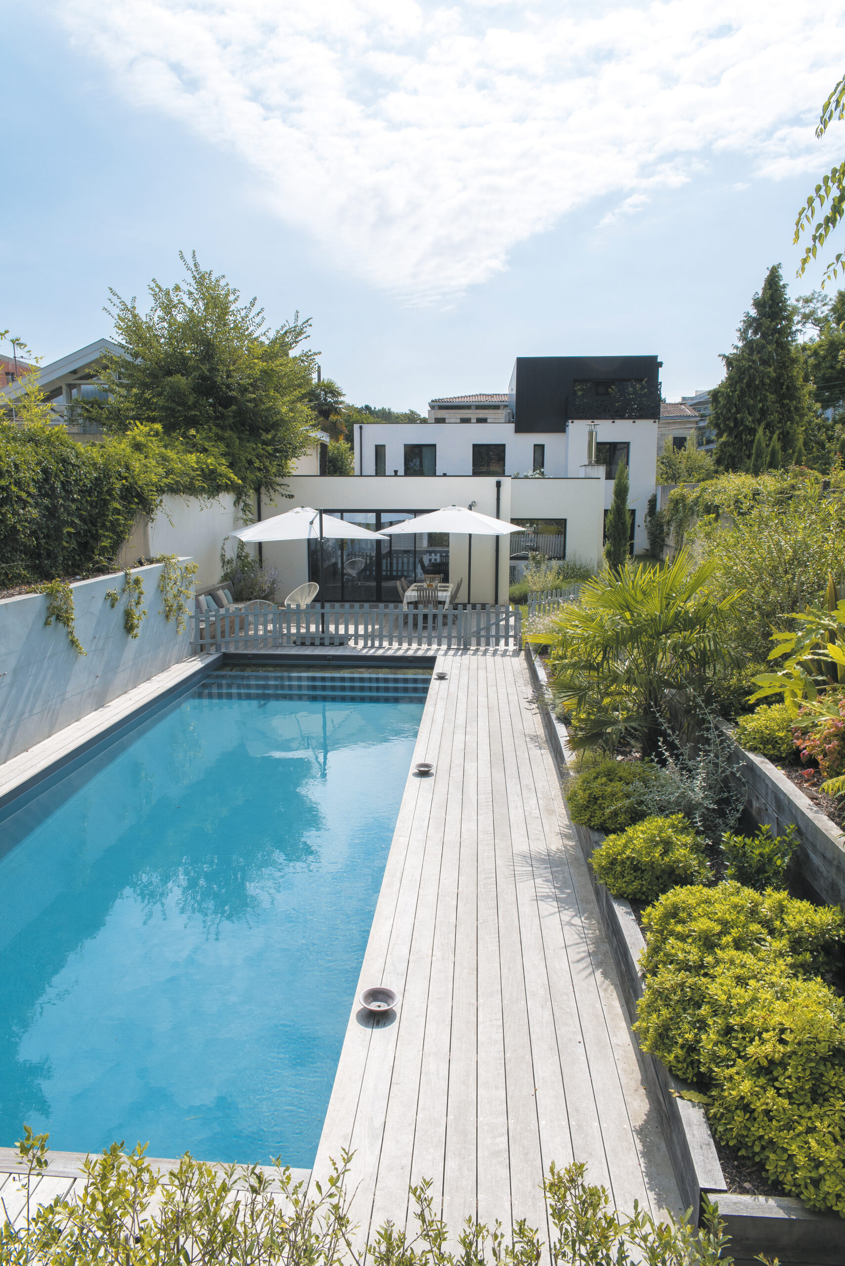 Tout a commencé par une immense butte de terre. Grâce au travail de décaissement, 300 m3 de terre ont été sortis pour parvenir à créer une plateforme piscine accessible de plain-pied de la maison. Des travaux de terrassement et de renforcement ont dû être menés au niveau du mur mitoyen. « Les clients voulaient essayer de conserver le maximum de jardin ; donc plutôt que de centrer la piscine, l’idée était de la coller au maximum contre ce mur », ce que Stanislas Tymowski a considéré comme une des difficultés du chantier. En effet, plus on se rapproche d’un mur mitoyen, plus on prend le risque de le fragiliser et de le « dessoucher ». L’opération a nécessité d’être précautionneux : « Nous sommes descendus sous les fondations du mur. Il nous a fallu d’abord créer un renfort avec un second mur pour retenir les terres ». Cette implantation particulière a été rendue possible grâce à une modification récente du Code de l’urbanisme dans la région : « Auparavant, avec la distance d’implantation, il fallait se situer soit à 3 mètres soit à 4 mètres, ou faire du bord-à-bord. La loi concernant l’urbanisme a changé à Bordeaux, il n’y a plus de problématique d’éloignement quant aux voisins. Nous étions d’autant plus tranquilles car la piscine a un lien direct avec le mur ».