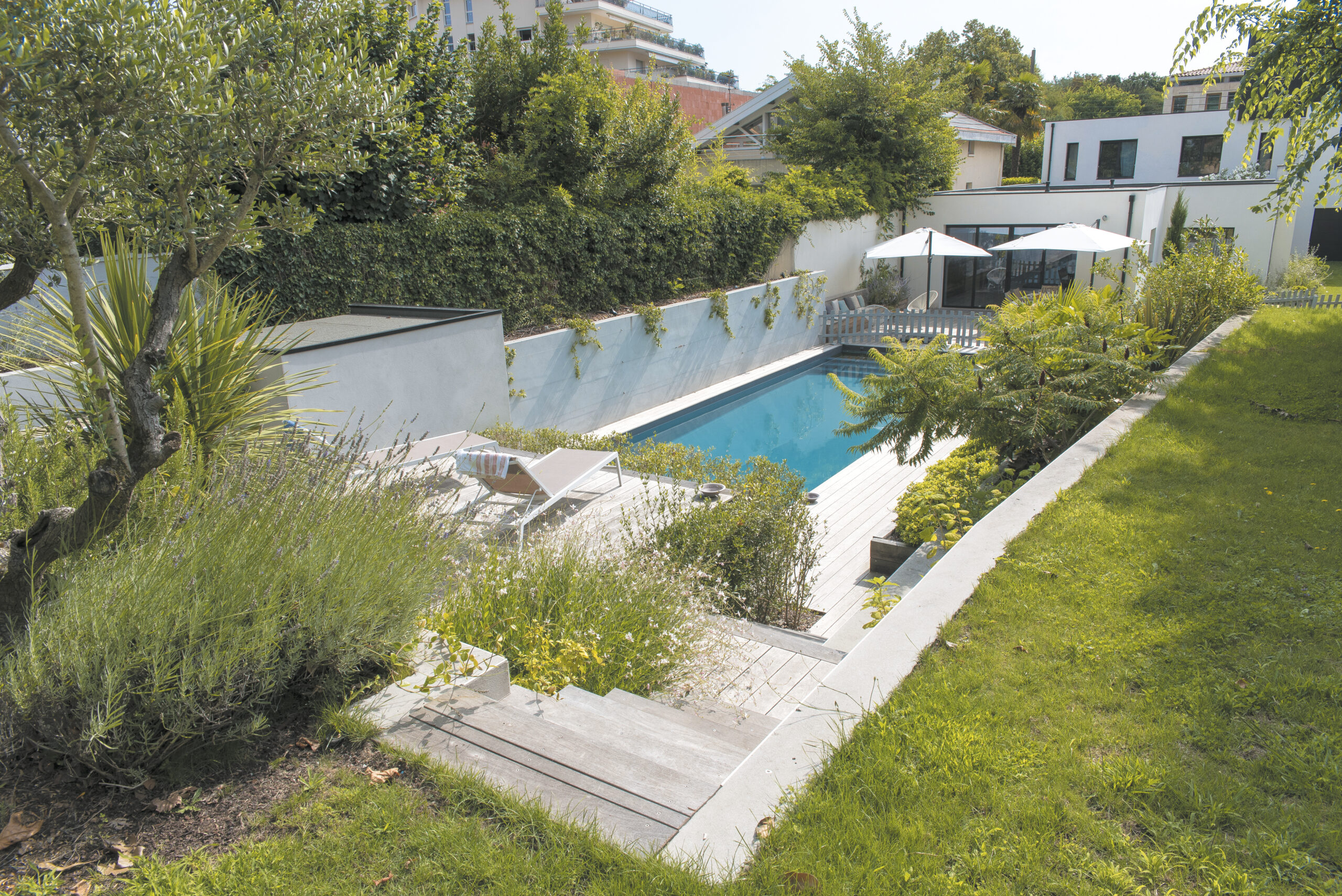 Les clients souhaitaient profiter d’un grand espace végétalisé. Cette partie complantée a nécessité plusieurs phases et s’est déroulée pendant celle de construction du bassin. Tout d’abord, « un apport de terre végétale assez important a été acheminé car la terre sortie lors du terrassement, assez argileuse, n’était pas exploitable pour le jardin ». Une fois la piscine montée, le paysagiste est intervenu pour étager la butte restante et retenir la terre au moyen de traverses en bois.