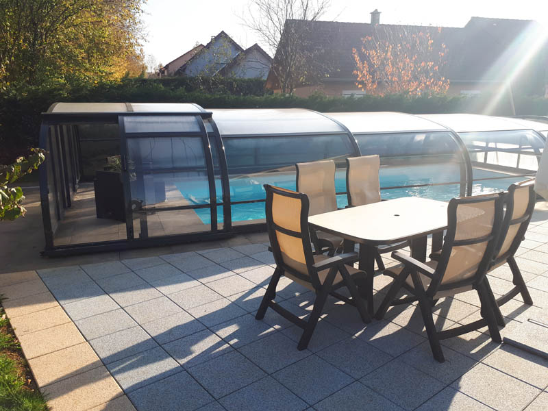 Aerys « le 020 », le petit nouveau. Il s’agit d’un abri de piscine bas, angulaire télescopique, structure aluminium thermolaquée gris clair RAL 7042 ou gris foncé RAL 7016, destiné avant tout aux utilisateurs qui privilégient la discrétion. Sa hauteur est seulement de 23 cm à l’angle du vitrage du petit module. Il dispose également d’un vitrage polycarbonate alvéolaire en toiture, 8 mm, et polycarbonate plein transparent sur les côtés et extrémités. Ces mêmes extrémités sont munies d’un verrouillage sécurisé.