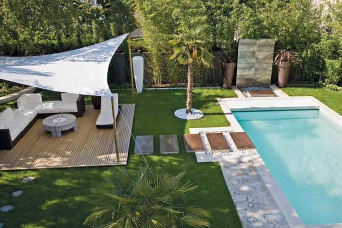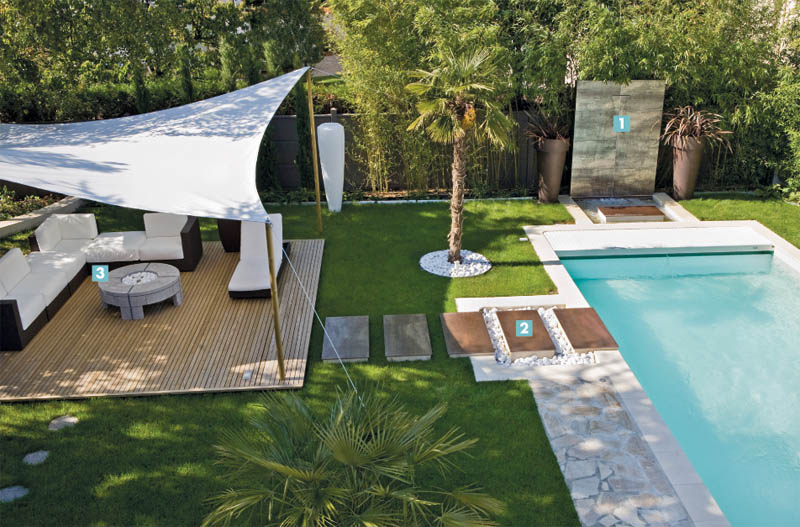 La douche et la cascade sont les deux éléments clés de la mise en scène de l’eau. Comme la piscine, elles créent un divertissement visuel. Leur installation en perpendiculaire autour du bassin offre un effet déco et donne du rythme au jardin, surtout que la cascade est en point de mire depuis l’espace lounge. Elles sont individuellement alimentées en eau.