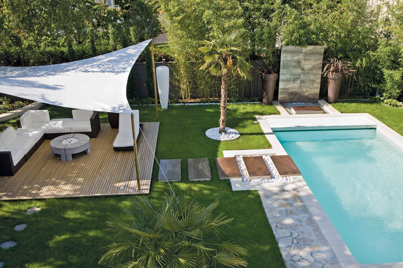 Conçus telle une pièce de vie, le jardin et sa piscine sont le théâtre de la nature. On y vient pour se détendre, comme dans un salon, au milieu d’un décor scénarisé. Les arbres et les vases sculpturaux combinés à la féerie de l’eau de la douche et de la cascade servent d’écrin au bassin.
