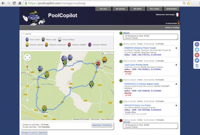 La fonctionnalité feuille de route du PoolCopilot offre une vision en temps réel de l’état parc de piscines afin d’optimiser les déplacements (PCFR).