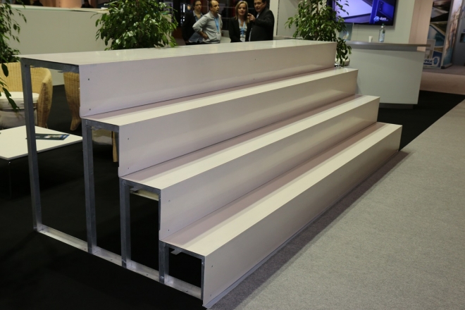 Il s’agit d’un modèle sous liner d’une longueur de 3 à 8 m sans raccord. Un nouveau modèle d’escalier sur liner a été également présenté à Lyon. Pratique, il peut être basculé pour faciliter le nettoyage du bassin.