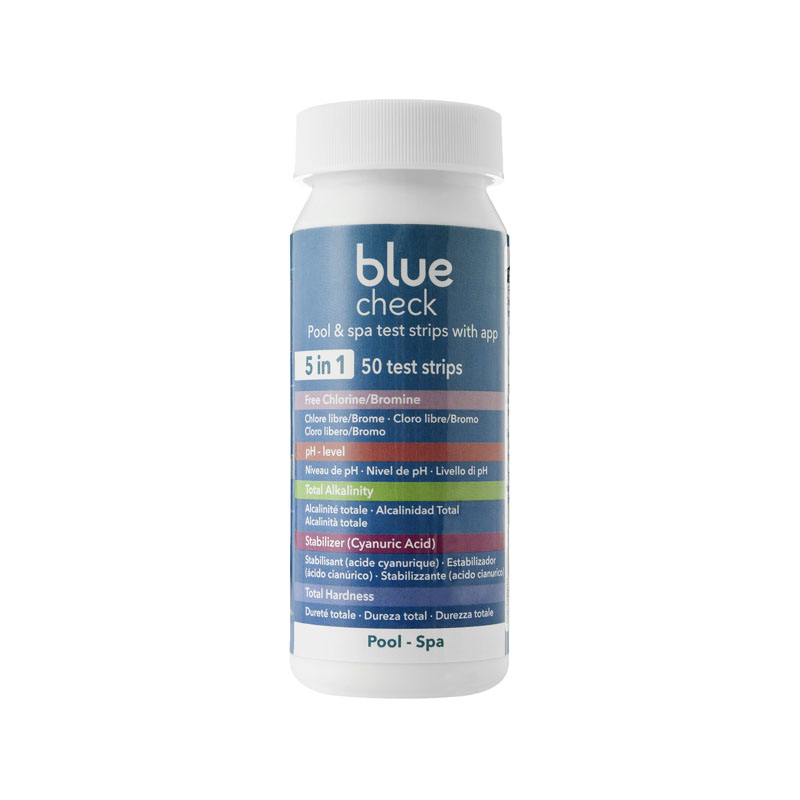 Une bandelette d’analyse Blue Check permet de mesurer les 5 paramètres principaux de l’eau. Après avoir pris connaissance des valeurs, l’utilisateur les saisit dans l’application Blue Connect. Il a alors accès aux résultats de l’analyse ainsi qu’aux recommandations de traitement. L’application propose également un historique des analyses précédemment effectuées et des informations météo.