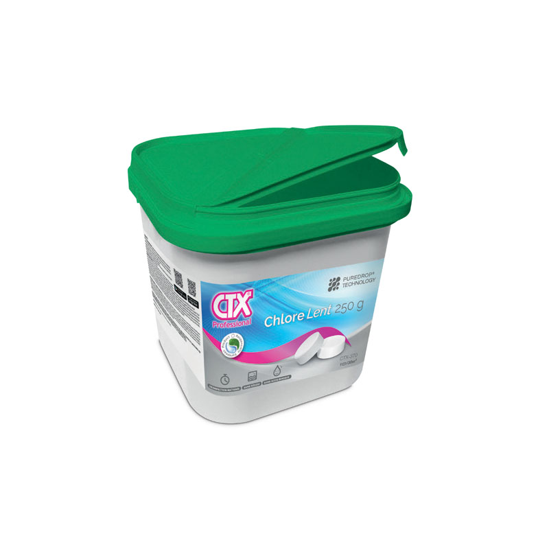 Bénéficiant de la formulation brevetée Puredrop Technology®, CTX Professional propose des galets de désinfection au chlore, ne contenant pas d’acide borique (perturbateur endocrinien). À dissolution lente, les galets possèdent une durée d’action longue leur permettant de contrôler la libération du chlore dans l’eau.