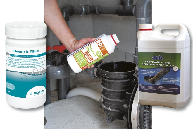 C’est également un grand classique en saison : dans certaines parties du bassin, très souvent les angles, des foyers d’algues persistent et restent difficiles à éliminer. La cause ? Vraisemblablement un filtre encrassé qui ne peut plus remplir efficacement sa mission en permettant un brassage de l’eau optimum. La solution la plus simple : détartrer en profondeur le filtre avec un produit adapté (ACTI Nettoyant Filtre, hth Filterwash, Netafilter CTX 57, Chemoform Filter Net Liquide, etc.) afin de le rendre à nouveau pleinement opérant. Cette action permettra de retirer l’ensemble du calcaire qui, faisant obstacle au passage de l’eau, engendre des pressions élevées dans le filtre, et donc des pertes de débit et un brassage de l’eau moindre. Une fois le filtre détartré, votre client constatera avec plaisir qu’il bénéficiera d’une belle eau tout en réalisant moins de traitements choc et en consommant moins de produits anti-algues. Bref vous lui aurez rendu cette piscine 100 % plaisir et vous aurez fait montre de votre professionnalisme.