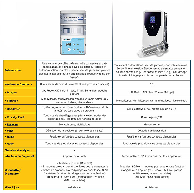 | La domotique piscine facile à installer, complète et flexible pour une autonomie maximale. Gestion de parc incluse. | Gestion complète du traitement de l’eau, pilotage des équipements principaux et contrôle à distance intégré. |
