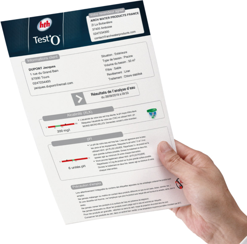Pour accompagner le lancement du WaterLink® SpinTouch™, hth lance Test’O™ Pro, une nouvelle application multiplateforme à destination des pisciniers. Cette dernière se connecte à l’appareil en Bluetooth ou par câble USB. L’utilisateur peut, à partir de l’interface de l’application, lancer une analyse de l’eau et en interpréter les résultats.