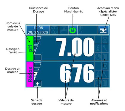 L’écran tactile facilite le réglage de chaque appareil de la gamme HYDRO’Touch tout en affichant toutes les informations nécessaires à l’utilisateur, professionnel ou consommateur. L’écran indique les valeurs de mesure, la puissance de dosage de chaque pompe ainsi que les alarmes et notifications. Le mémo latéral rappelle, en permanence, la signification de chaque icone.
