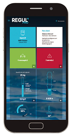 Depuis le tableau de bord, IDOit Connect permet la surveillance à distance de nombreux paramètres : nombre d’heures de la cellule, mesure du pH, mesure du taux de sel, niveau du bidon pH… De plus, ces données et mesures sont historisées afin d’aider le professionnel dans son diagnostic