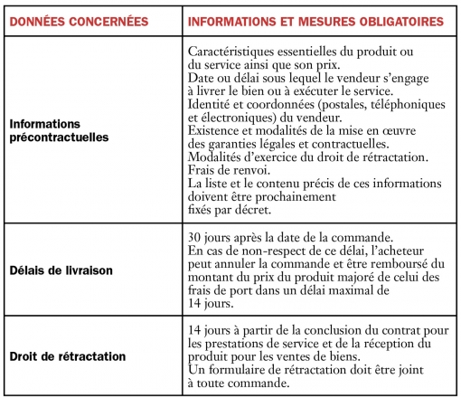 « Les modifications apportées par la loi du 17 mars 2014 concernent en premier lieu l’information donnée aux consommateurs, avant même que ceux-ci ne concrétisent leur acte d’achat », prévient Me Rodolphe Auboyer-Treuille, avocat au barreau de Lyon, spécialisé en droit de la consommation. Désormais, il est donc impératif d’afficher plusieurs éléments sur le site de vente en ligne ou sur les supports utilisés pour pratiquer la vente à distance :