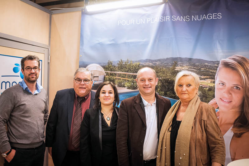 Sur le stand ABPool, entourant Matthieu Bouvier et la goulotte tampon Isi-Miroir, Fabien Saussac (Filtrinov) et David Hamouni, de la société Cristalis qui commercialise les produits Flovil.