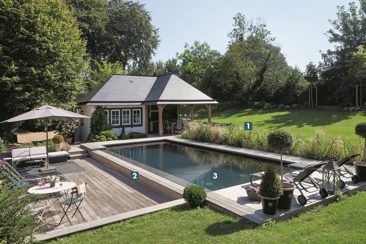 La théâtralisation de la végétation d’un lieu avec des essences appropriées et une implantation précise permet de lui donner un sens et de créer une ambiance de détente et de confort. Avec une haie foisonnant le long du bassin, l’effet naturel et champêtre est parfaitement obtenu.