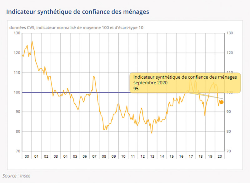 En septembre 2020, l’indicateur qui synthétise la confiance des ménages dans la situation économique a été stable. Il s’est maintenu à 95 par rapport au mois précédent, en dessous de sa moyenne de longue période (100), mais bien au-dessus des années 2008 à 2014.