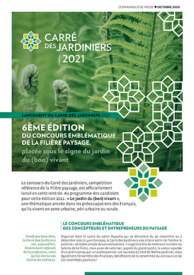 Le concours du Carré des Jardiniers 2021 est lancé. Ouvert à tous les concepteurs et entrepreneurs du paysage, le concours « Carré des Jardiniers » a lieu tous les deux ans dans le cadre du salon Paysalia. Cette 6e édition se déroulera du 30 novembre au 2 décembre 2021, à Lyon Eurexpo.