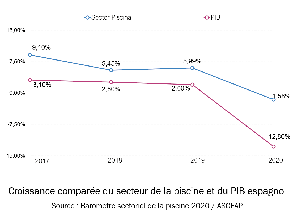 • 1 254 milliard d’euros de chiffre d’affaires. Le chiffre d’affaires du secteur devrait connaître une baisse de l’ordre de -1,58 % par rapport à 2019 (+5,99 %). Cette baisse est principalement imputable au marché de la piscine collective, fortement impacté par la Covid-19. L’ASOFAP compare ce chiffre au PIB espagnol, en baisse de -12,8 % sur la même période.