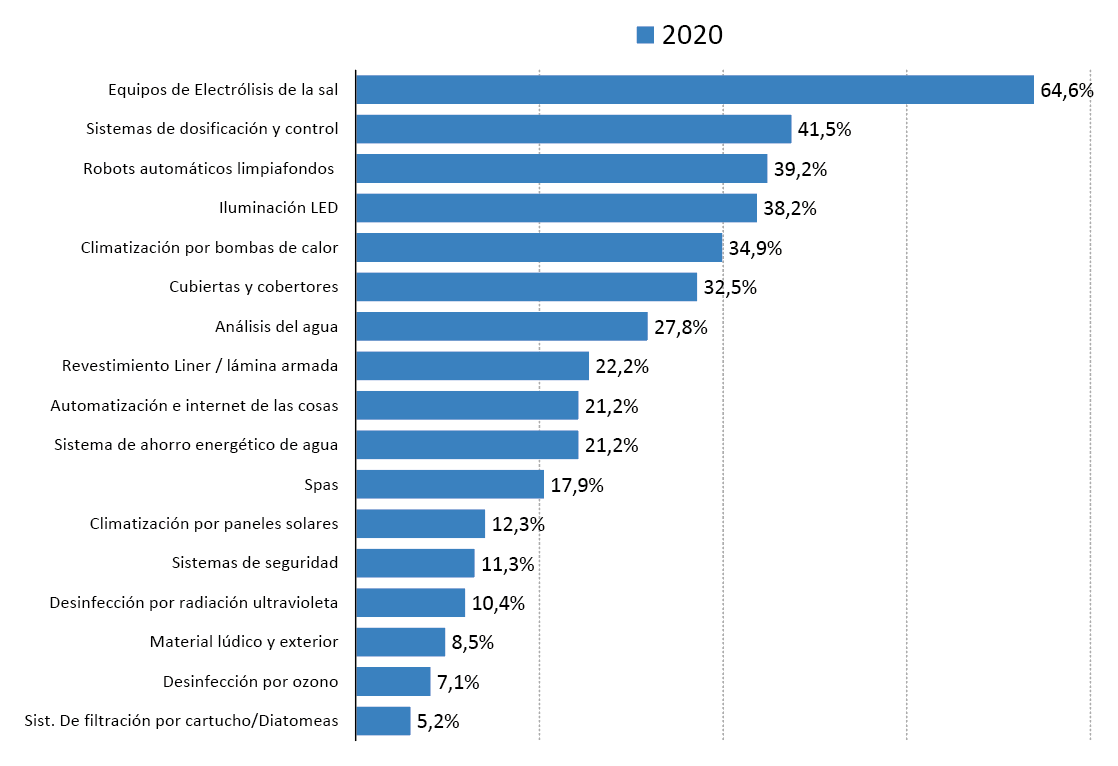 D’après le baromètre, les produits les plus demandés sont des équipements liés au traitement et au nettoyage du bassin. L’électrolyseur s’impose comme le produit le plus demandé (64,6 %), suivi par les systèmes de régulation (41,9 %) et les robots électriques (39,2 %). La pompe à chaleur se place en 5e position (34,9 %) suivie par les couvertures et volets (32,5 %). Seulement 11,3 % des clients ont demandé des systèmes de sécurité, l’Espagne n’ayant pas légiféré sur le sujet.