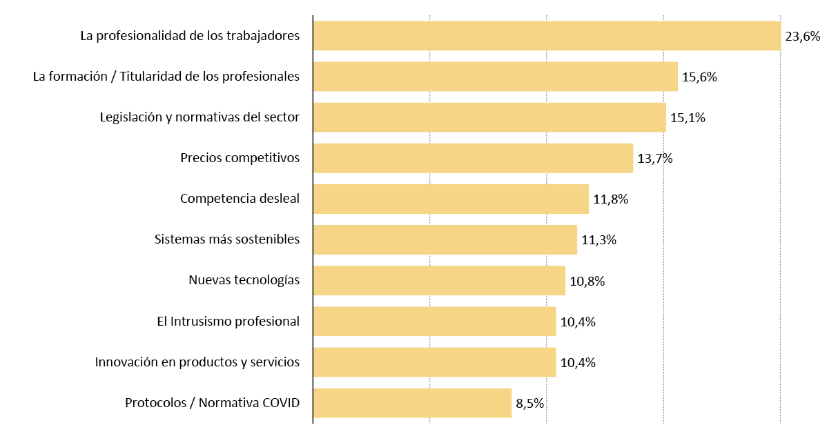 Pour les entreprises interrogées, les 3 principaux défis à relever par le secteur concernent le professionnalisme des techniciens piscine (23,6 %), la formation et la qualification (15,6 %), la législation et les normes (15,1 %).