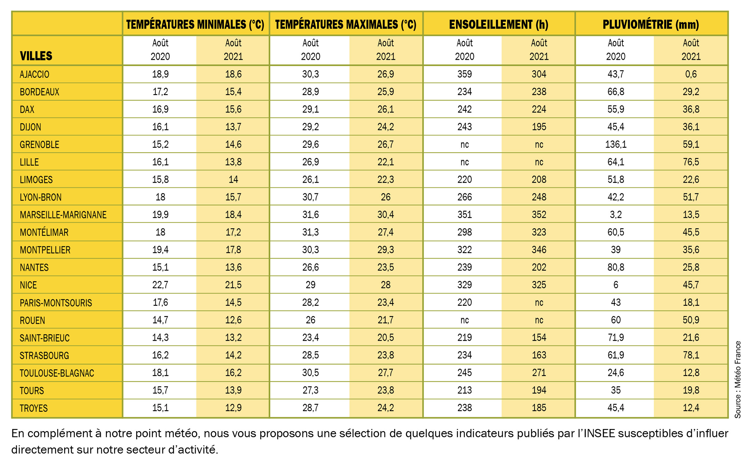 Les précipitations ont été déficitaires de 30 à 70 % sur la majeure partie de l’Hexagone et de plus de 70 % sur la Corse. Le déficit a atteint 40 % en moyenne sur le pays et sur le mois. Le mois d’août 2021 se classe au 6e rang des mois d’août les moins arrosés depuis 1959.