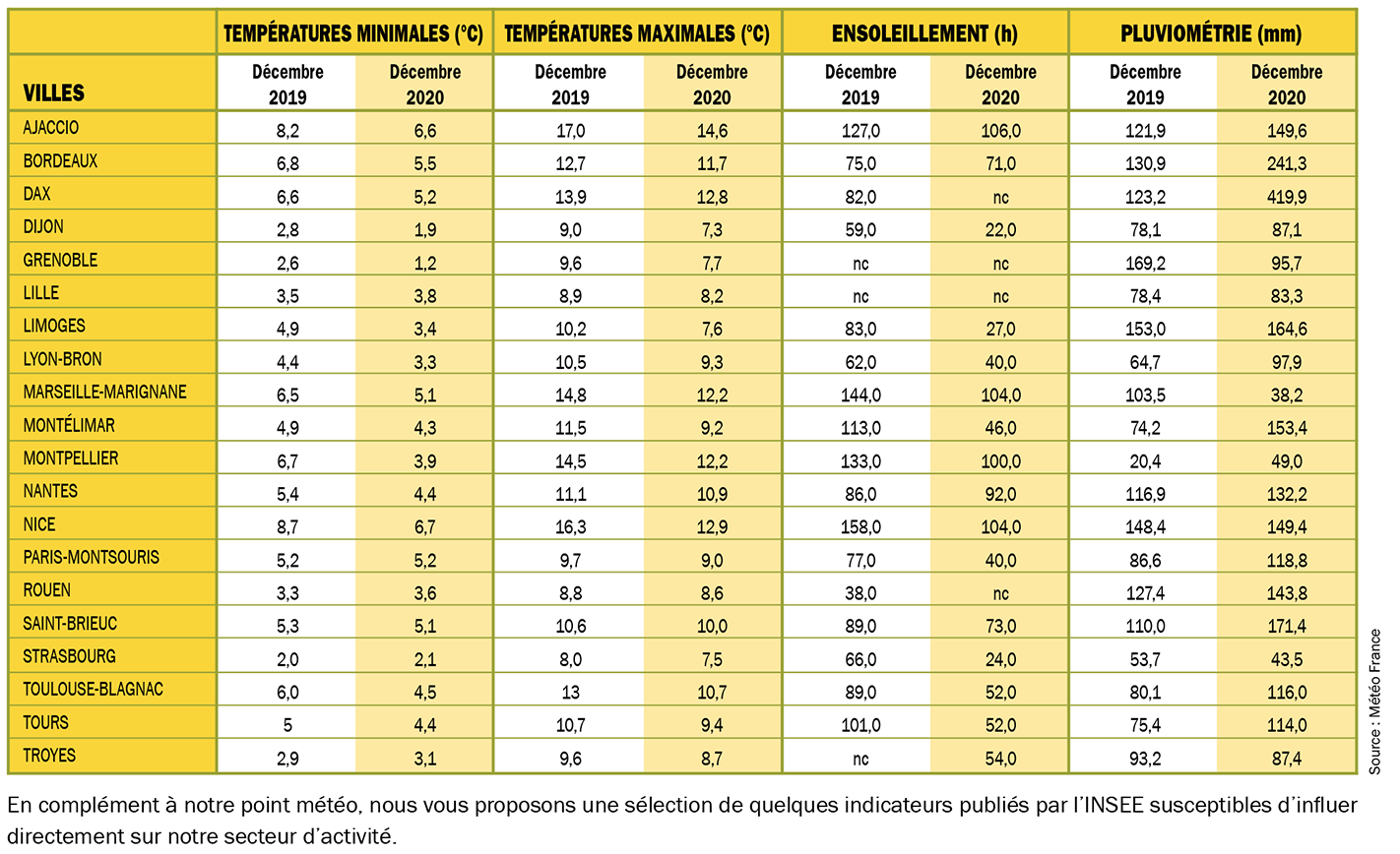 Les températures du mois ont été en moyenne 1 à 2 °C au-dessus de la normale, hormis dans le Limousin, en l’Occitanie, en PACA et en Corse où elles ont été plus conformes à la saison. Avec 1,3° C au-dessus de la normale, décembre 2020 a connu une température moyenne de 6,9°C.