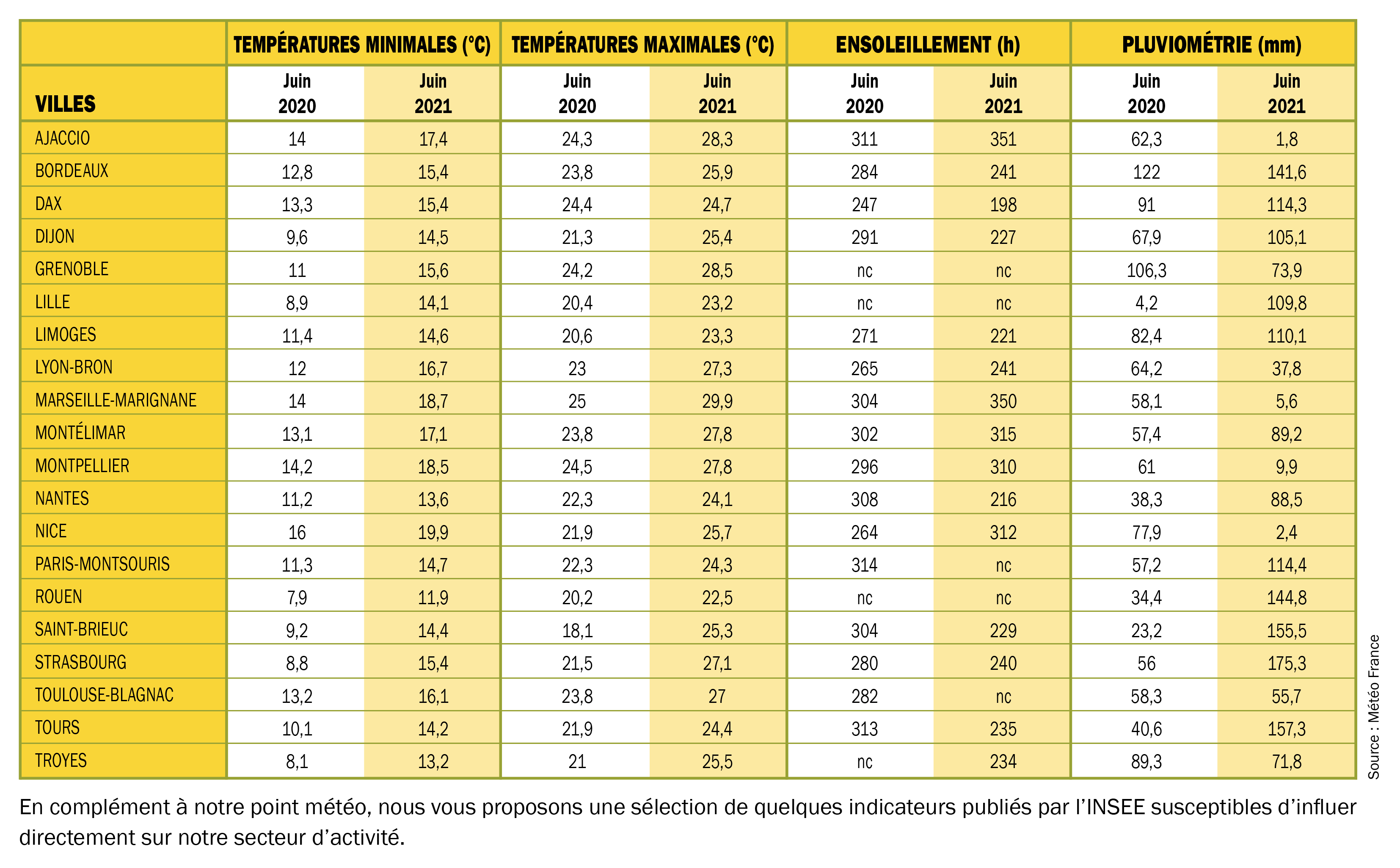Le mois de juin 2021 a été remarquablement chaud avec un épisode précoce de fortes chaleurs en milieu de mois et des passages pluvio-orageux très fréquents sur une grande partie du pays. Ces derniers, parfois violents avec localement des pluies intenses qui ont provoqué des inondations et des coulées de boues, de la grêle et de fortes rafales de vent.
