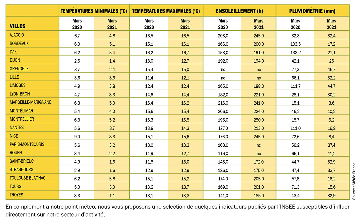 Mars 2021 a été un mois très anticyclonique : avec un fort ensoleillement, peu de précipitations, peu de vent fort et des journées avec de fortes amplitudes thermiques. En milieu de mois, un épisode de froid marqué s’est toutefois accompagné de chutes de neige jusqu’en plaine sur le Nord-Est et la Provence.