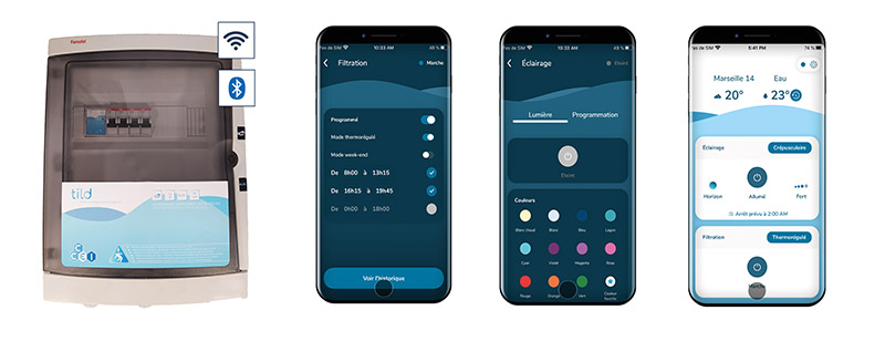 tild, c’est un coffret électrique nouvelle génération entièrement assemblé à Marseille, au siège de la société. Ce nouvel appareil permet de piloter les fonctions essentielles de la piscine intelligemment avec son smartphone.