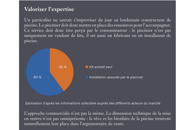 Le positionnement marketing de la piscine en kit repose en grande partie sur l’accessibilité financière du produit, accessibilité rendue possible par le fait que l’acheteur installe lui-même sa piscine. Si le client est autonome, il ne doit pas pour autant être isolé. L’achat d’une piscine, même en kit, représente un investissement important pour un ménage. La mise en œuvre du bassin n’est pas une opération anodine et certaines étapes d’exécution sont complexes. Le support technique proposé par le professionnel est donc indispensable. Le piscinier qui intègre le kit à son offre doit donc garder à l’esprit qu’il devra à un moment ou un autre se rendre disponible pour accompagner son client lors du montage.
