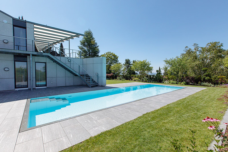 C’est le cas de Linz & Partner Schwimmbadtechnik GMBH. Ce revendeur basé en Suisse a réalisé en 2017, une piscine à débordement Niveko de la gamme Advance Whisper. En adéquation avec la maison d’architecte des propriétaires, cette piscine aux lignes géométriques se caractérise par un niveau d’eau surplombant le rebord en pierre en granit naturel contemporain.