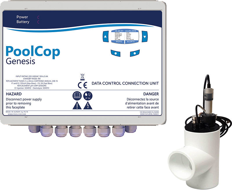 Compatible avec toutes les configurations de piscines privées et commerciales, existantes ou en construction, le PoolCop Genesis est fourni avec un module de contrôle et de communication (CCU) et une chambre d’analyse à monter en ligne. L’équipement est disponible sous forme de pack comprenant le traitement d’eau (chlore ou électrolyse de sel).