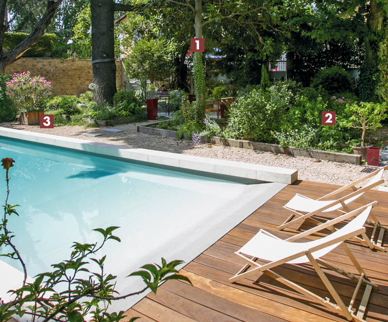 Le choix de Piscine Plage® est guidé par l’aspect économique et écologique, ainsi que par la facilité d’installation en termes de terrassement, d’évacuation de la terre et de volume d’eau requis pour un chauffage solaire. Équipée d’un système balnéo pour la relaxation et d’une nage à contre-courant pour le côté sportif, la piscine appelle à la détente dans un cadre paysager hautement naturel, chargé de parfums. Elle se souligne d’une margelle en pierre d’Estaillade blanche et s’adoucit d’une plage en bois de cumaru. Elle abrite sous ses lames l’échangeur thermique qui est couplé aux panneaux solaires posés sur le toit. Pour la signalétique, ses contremarches sont équipées d’un éclairage led.
