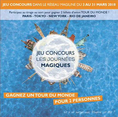 Un jeu concours est organisé dans le cadre des Journées magiques pour gagner un tour du monde pour 2 personnes. Pour participer au tirage au sort, il faut répondre à 2 questions et remettre au plus tard le 31 mars le formulaire rempli, en mains propres ou lors d’un rendez-vous dans un magasin Magiline.