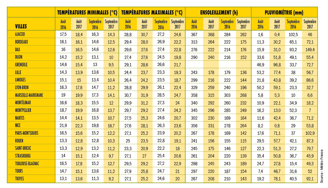 Après un début d’été très chaud (excédent de température de 2,8 °C au mois de juin), le mois d’août a été beaucoup plus modéré, avec un excédent de 0,8 °C en moyenne. Les précipitations présentent encore un déficit de l’ordre de 8 %. L’ensoleillement a été proche de la normale. Le mois de septembre, quant à lui, a été frais avec un déficit des températures de 1 °C (températures particulièrement fraîches du 15 au 20). Les précipitations accusent un déficit de 9 % en moyenne (Nord-Est bien arrosé et sécheresse aggravée dans le Sud-Est). L’ensoleillement a été déficitaire de 9 %. (sources : Météo France et La Chaîne Météo).