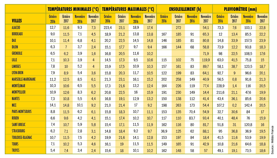 Le point météo : durant le mois d’octobre, les températures, sur l’ensemble du pays, ont été légèrement inférieures à la moyenne (– 0,9 °C). La pluviométrie a été très déficitaire (– 40 %) pour le 4e mois consécutif, et l’ensoleillement légèrement déficitaire. Au mois de novembre, les températures ont été proches de la moyenne tandis que les précipitations ont été très en dessous des normales (– 19 %) sur l’ensemble du pays, avec un déficit encore plus marqué dans le Sud-Est. L’ensoleillement, quant à lui, a été supérieur aux moyennes de 20 %. (Sources : Météo France et La Chaîne Météo).