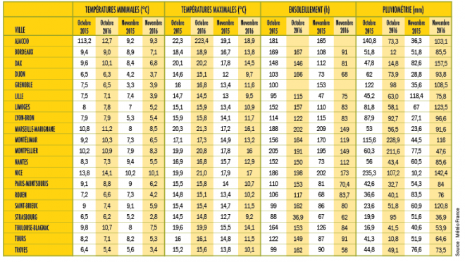 La pluviométrie a été excédentaire sur une grande partie du pays (3 fois au-dessus de la normale en PACA et en Corse). L’ensoleillement, déficitaire du Sud-Ouest au Nord-Est, a été proche des normales sur les régions méditerranéennes (source Météo France).
