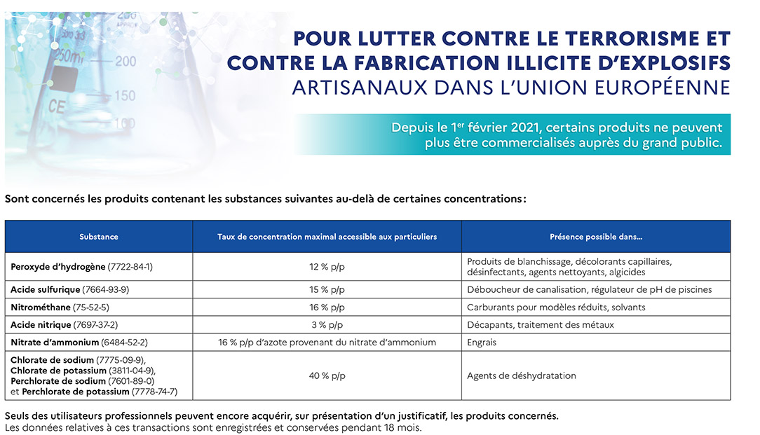 • Affiche Précurseurs d’explosifs : liste des produits concernés.