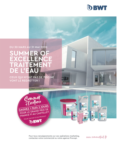 Christophe Durand : Nos deux opérations Summer of excellence robots et Summer of excellence traitement de l’eau ont toutes deux pour objectif de permettre à nos clients professionnels de générer dans leurs points de vente un trafic consommateurs important en mettant en scène les gammes BWT, robots et produits de traitement, grâce à des kits PLV et à des opérations de communication adaptés, et ce en fonction de leurs achats. Leurs consommateurs bénéficieront quant à eux, grâce à l’opération Summer of excellence robots, de bons d’achat à valoir sur des produits de traitement BWT et de la possibilité de gagner, pour tout achat d’un produit de traitement BWT, un Pass VIP de 3 jours pour le Grand Prix de Formule 1 du Castellet. Les détails de ces opérations sont les suivants :