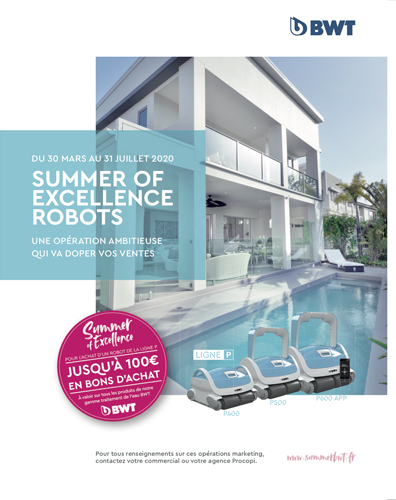 • Summer of excellence Robots : pour toute commande de 16 robots BWT de la ligne P, nos revendeurs recevront gratuitement le Kit Silver, un ensemble de matériels PLV permettant de théâtraliser efficacement leurs points de vente. Pour toute commande de 48 robots ils recevront le Kit Gold, composé de matériels PLV, et bénéficieront en outre d’une campagne digitale de 800 €, financée à 50 % par BWT ou d’une campagne SMS réalisée sur un fichier de propriétaires de piscines sur leur zone de chalandise, financée également à 50 % par BWT. Ils bénéficieront également d’une campagne d’affichage locale d’une semaine financée à 50 % avec un montant maximum de 1 500 €. Leurs clients, eux, bénéficieront d’offres alléchantes sous forme de bons d’achat à valoir sur les produits de traitement BWT :