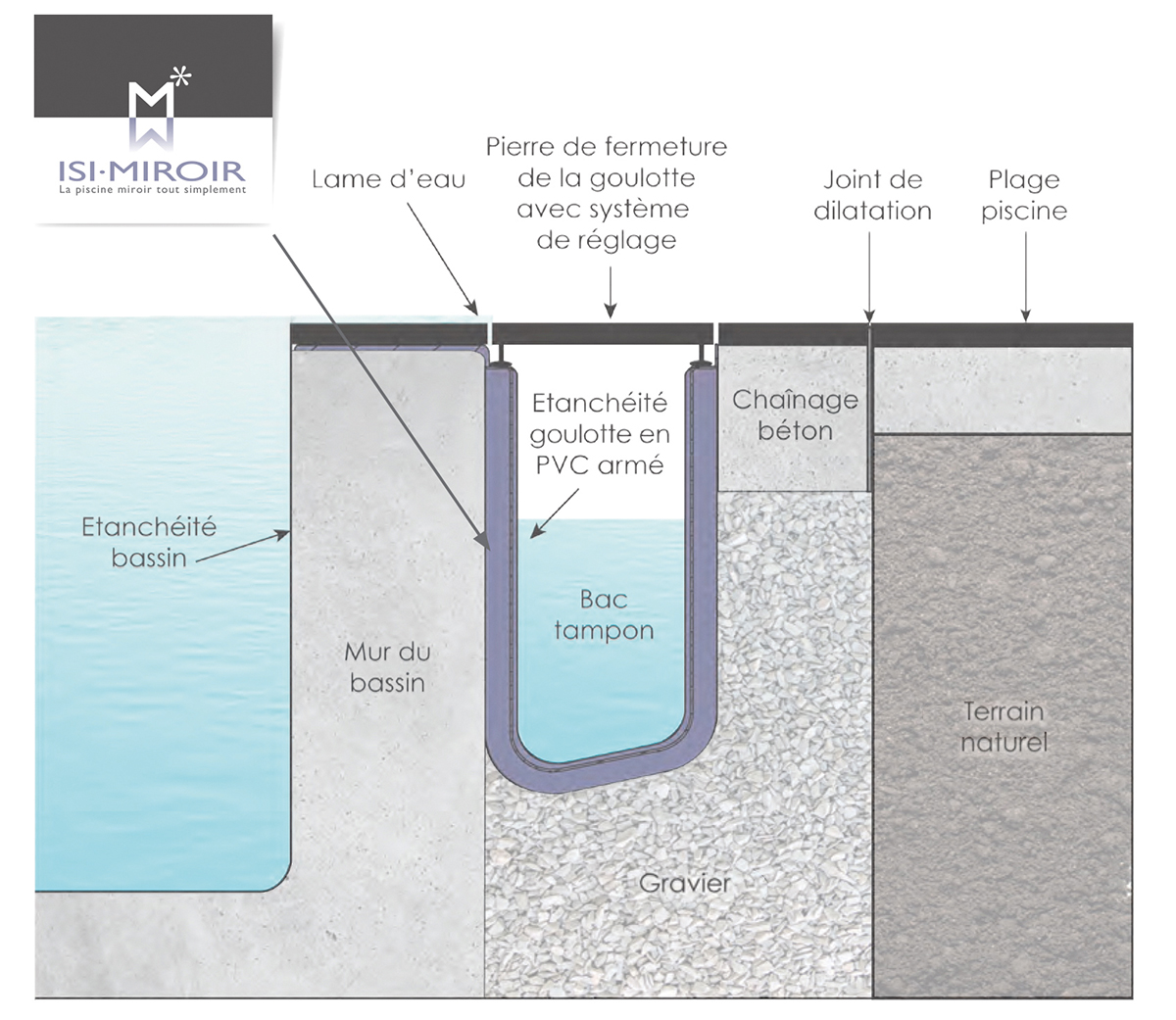 Cette goulotte bac tampon permet de réaliser une piscine miroir sans bac tampon. ISI-MIROIR a été conçue pour maîtriser la construction d’une piscine miroir sans avoir à calculer le dimensionnement des goulottes, des drains, du bac tampon, etc. Son installation convient à la construction comme à la rénovation. Ce système breveté intègre, en un seul élément modulaire, une goulotte, un bac tampon ainsi qu’un dispositif de réglage des pierres de fermeture de la goulotte.