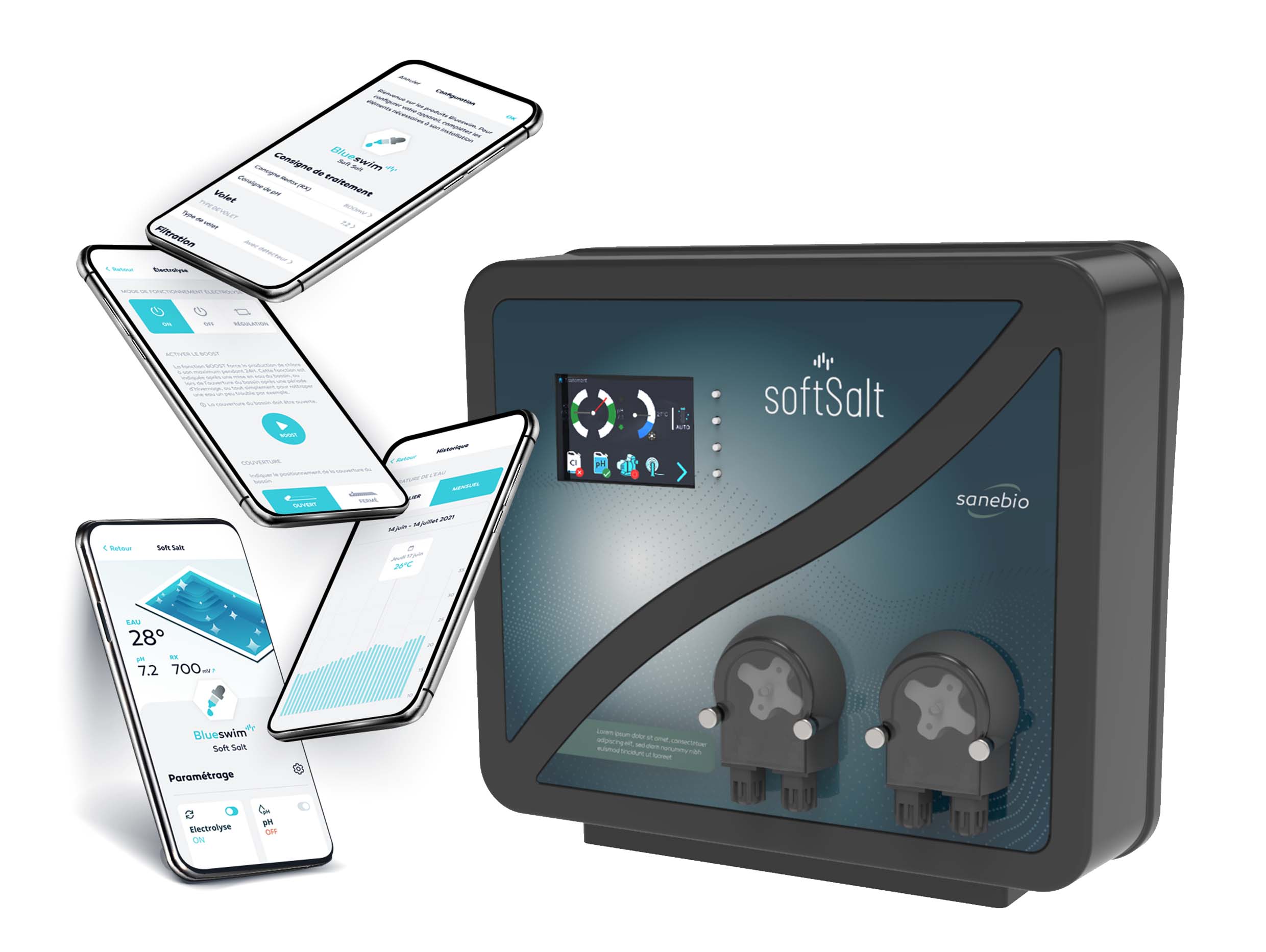 Évolutif, le Soft Salt s’adapte aux usages en se déclinant en différentes configurations : pH et/ou Chlore + fonction rX/pH (mesure/injection + niveau Bac). Selon les versions, il couvre une plage de concentration de sel de 1,5 g/L à 4,5 g/L. La gestion de l’électrolyseur peut s’effectuer depuis le boîtier de contrôle équipé d’un écran LCD ou via un smartphone connecté en Bluetooth®. L’application mobile gratuite dédiée Blueswim permet de piloter le traitement de bassins de 40m³ et 60m³, de manière simplifiée et intuitive.